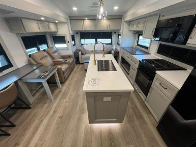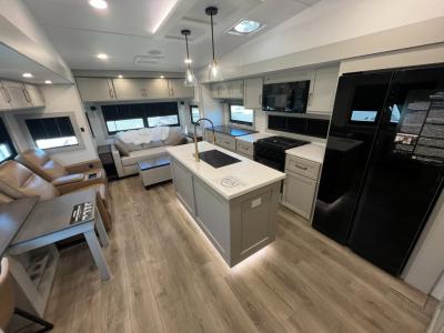 Sleeps 4 Slides 3 Length 34 ft 11 in Ext Width 8 ft Ext Height 13 ft 3 in Hitch Weight 2298 lbs GVWR 15495 lbs Dry Weight 12276 lbs Fresh Water Capacity 75 gals Grey Water Capacity 90 gals Black Water Capacity 45 gals Tire Size 215/75 R17.5 Furnace BTU 35000 btu Available Beds King Refrigerator Type 12V Refrigerator Size 16 cu ft Cooktop Burners 3 Shower Size 30" x 42" Number of Awnings 2 Axle Weight 7000 lbs LP Tank Capacity 30 lbs Water Heater Type Tankless On Demand AC BTU 31500 btu TV Info LR 50" Smart Telescoping TV, BR 32" Smart TV Awning Info 11' & 15' Electric w/Neon COB/Dotless LED Lighting Axle Count 2 Washer/Dryer Available Yes Number of LP Tanks 2 Shower Type Standard Similar Fifth Wheel Floorplans